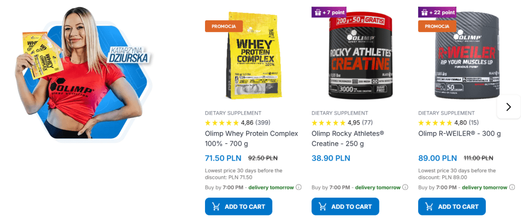 Overview of OlimpStore’s product range (supplements, equipment, apparel)